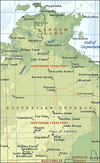 LOCATION: In the Central-north of Australia between Queensland and Western Australia, and north of South Australia. CLIMATE:Highest temp. 48.2° C at Charlotte Waters; lowest -7.5° at Alice Springs. The Top End has a high rainfall in the 'Wet Season' (Nov.to March) with warm winters due to its proximity to the equator. The southern section has mainly hot, dry weather with very cold winter nights.